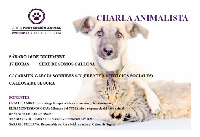 Desde el Área Animalista del Círculo de Podemos, queremos dar voz a aquellos que sufren en silencio, por ello, estamos organizando una serie de charlas sobre el abandono y el maltrato animal, siendo la primera charla en Callosa de Segura. Contaremos con la participación de una abogada especialista en la defensa animal, representantes de AsoKa y A.P.A.D.A.C., y de responsables de Áreas animalistas tanto de Elche como de Callosa. Dicho evento tendrá lugar el próximo sábado 16 a las 17 horas en la sede de Somos Callosa.