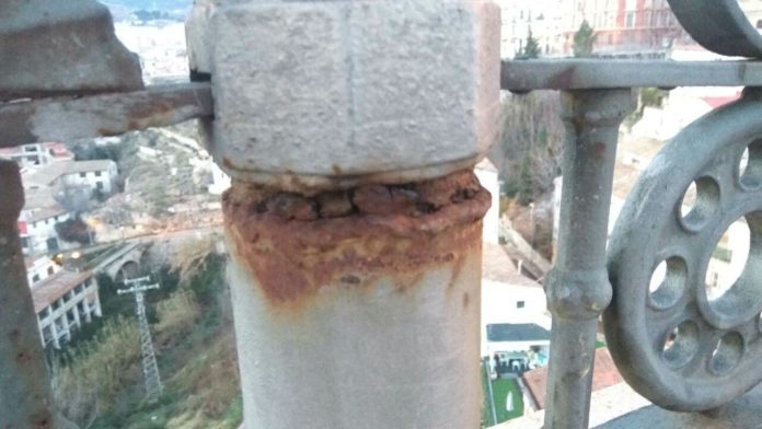 Como hemos podido comprobar personalmente y en las fotos que adjuntamos, la situación de las farolas de la barandilla del puente del Viaducto presentan grandes agujeros a la base producidos por la corrosión. Un total de 10 farolas de iluminación además de una gran cantidad de pilares de las barandillas, puntos de unión de la barandilla con la plataforma, presentan un estado de deterioro importante.