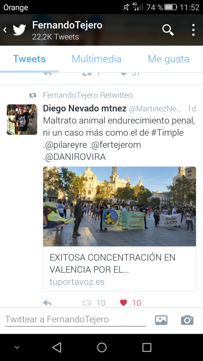 Diego nos indica que » es algo muy positivo que los famosos aprovechen los miles y miles de seguidores que tienen en las redes sociales para concienciar sobre una lacra cómo es el maltrato animal y agradecemos en este caso a Fernando Tejero y a Pilar Eyre por haber difundido el artículo sobre el acto que hicimos en Valencia para que se endurezcan las penas por maltrato animal y para que casos como el de el perrito timple dónde hay ensañamiento, sadismo y resultado de muerte no queden impunes ante la ley y por ello seguiremos trabajando»