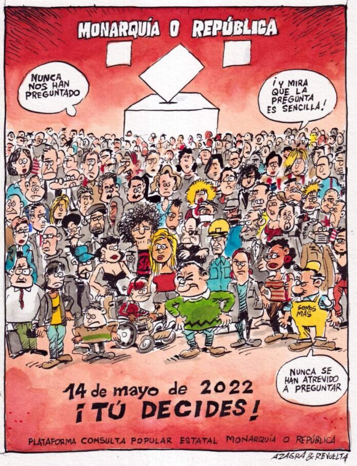 La Plataforma Consulta Popular Estatal Monarquía o República, entidad integrada por una amplia representación de fuerzas políticas y sociales de todo el estado, convoca para el próximo sábado 14 de mayo de 2022 la realización en todos los municipios donde se pueda de una consulta no oficial ni vinculante sobre el modelo de Estado que prefiere la ciudadanía: Monarquía o República.