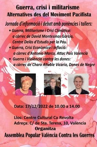 El Centro Cultural Ca Revolta de la ciudad de Valencia acogerá este sábado, 17 de diciembre, el encuentro “Guerra, Crisis y Militarismo, Alternativas Desde el Movimiento Pacifista”, organizado por la Asamblea Popular Valencia Contra las Guerras. El evento tendrá lugar de 10h a 14h y contará con la presencia de tres ponentes ─David Montesinos, del Centre Delás d’Estudis per la Pau; Antonio Marco, de Attac País Valencià y Charo Altable, de Mujeres de Negro─ que hablarán sobre la guerra y su relación con la crisis climática, el militarismo, la crisis económica, la inflación y la violencia contra las mujeres. Tras las ponencias se realizarán talleres para profundizar en los temas desarrollados en las mismas. La jornada finalizará con la puesta en común de las aportaciones y propuestas debatidas en los talleres y la elaboración de un calendario de iniciativas y acciones a llevar a cabo por el movimiento pacifista en los próximos meses. La participación será libre para todas las personas interesadas hasta completar el aforo.