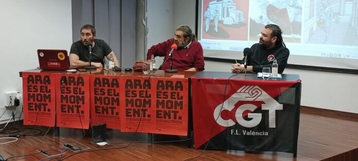 Juan Miguel Font, secretari general de CGT València, va ser l’encarregat de presentar aquesta nova xarrada fent un repàs als actes que s’han realitzat al llarg de la setmana en aquestes jornades llibertàries que van començar amb la presentació de la guia sobre Plans d’Igualtat en una assemblea de delegades i afiliades a la qual van assistir entre altres Miguel Fadrique, secretari general de CGT, Elisenda Rotger, secretària de la dona de CGT, i Maribel Ramírez, secretària d’acció sindical de CGT i van seguir amb les xarrades debat de José Luis González Reyes sobre crisi energètica, Carlos Taibo sobre com fer front a l’ecofeixisme, el programa especial de CGT en Acció sobre repressió sindical i com fer-li front amb César Yagües, company de CGT Aragó-La Rioja, i Lola Lloreda, companya de CGT Andalusia, Ceuta i Melilla; el debat sobre mitjans de comunicació amb Aniceto Arias de Ràdio Klara i Lucas Marco, periodista d’Eldiario.es.