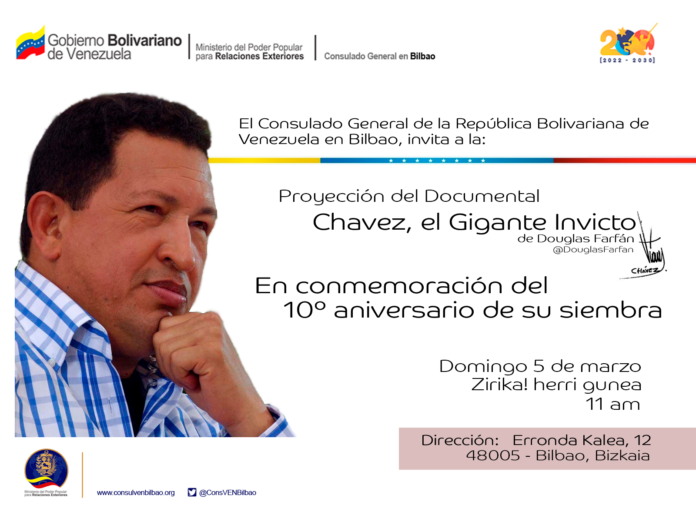 El Consulado General de Venezuela en Bilbao, en ocasión de la conmemoración del 10º aniversario de la siembra del comandante HUGO CHÁVEZ, se complace en invitarlos a la proyección del documental “CHÁVEZ, EL GIGANTE INVICTO”.