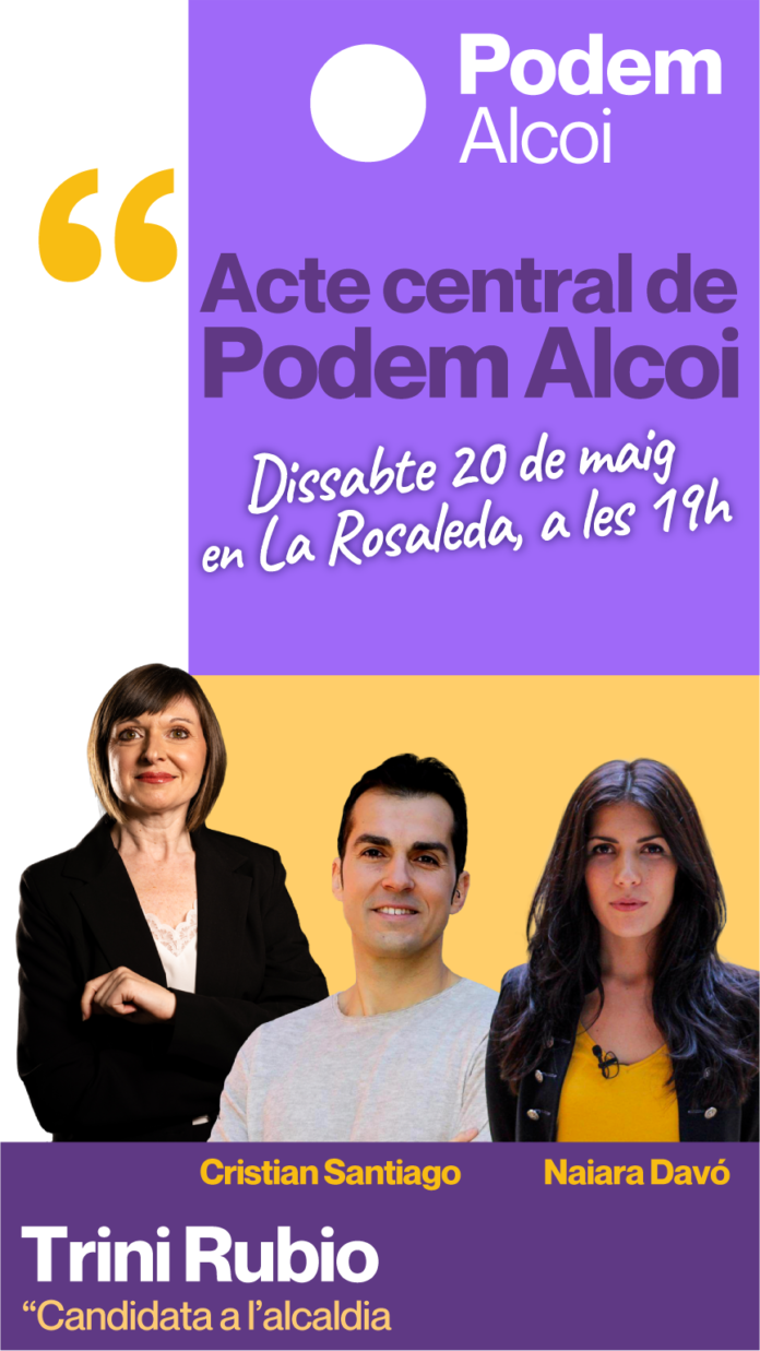 El proper dissabte 20 de maig, a les 19:00 hores al Parc de la Rosaleda, Podem Alcoi, celebrarà el seu acte central en aquest camí cap al 28M, de la mà de la seua candidatura, encapçalada per Trini Rubio.