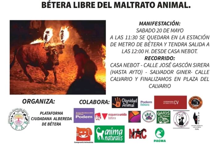 El próximo sábado tendrá lugar en Bétera una manifestación para rechazar la tortura como diversión y es que los llamados taurinos, se divierten mediante su «espectáculo» en lo que lo único que vemos es sadismo subvencionado con dinero público y poniendo en peligro a la infancia tanto en su seguridad como derechos.
