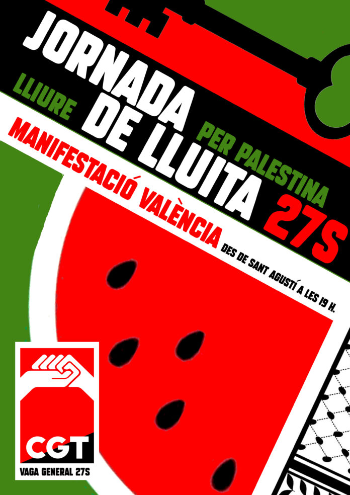CGT ha realitzat una crida a tots els sindicats i a tota la societat civil a solidaritzar-se i emprendre accions col·lectives este pròxim 27 de setembre per a denunciar el genocidi que s’està cometent cap al Poble Palestí per part de l’Estat d’Israel.
