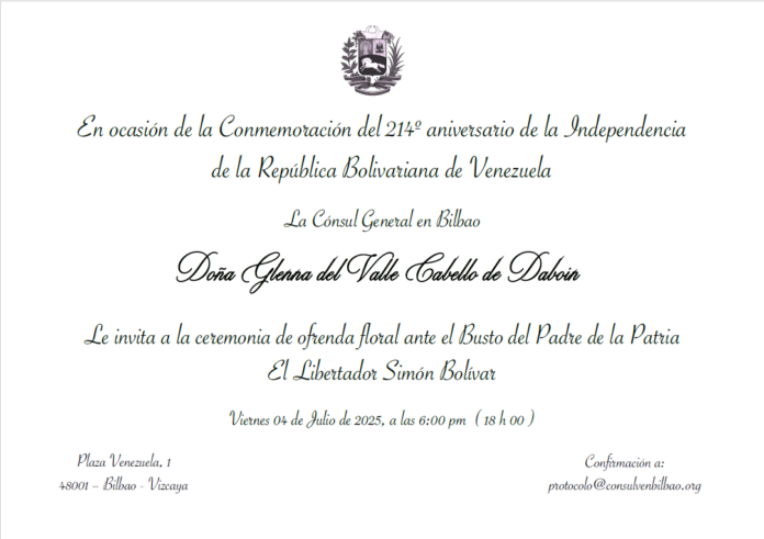 La Cónsul General de Venezuela, Doña Glenna del Valle Cabello de Daboín, tiene el placer de invitarle a la Ofrenda Floral que ofrecerá el próximo viernes 4 de julio a las 18:00 horas (6:00 pm), en ocasión de la Conmemoración del 214º Aniversario de la Independencia de Venezuela.